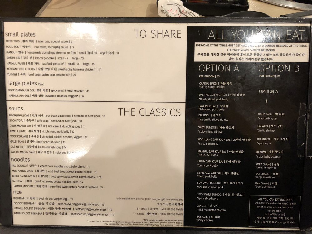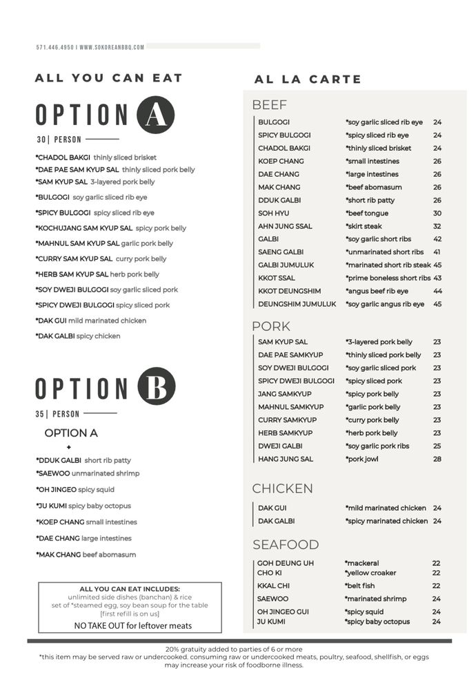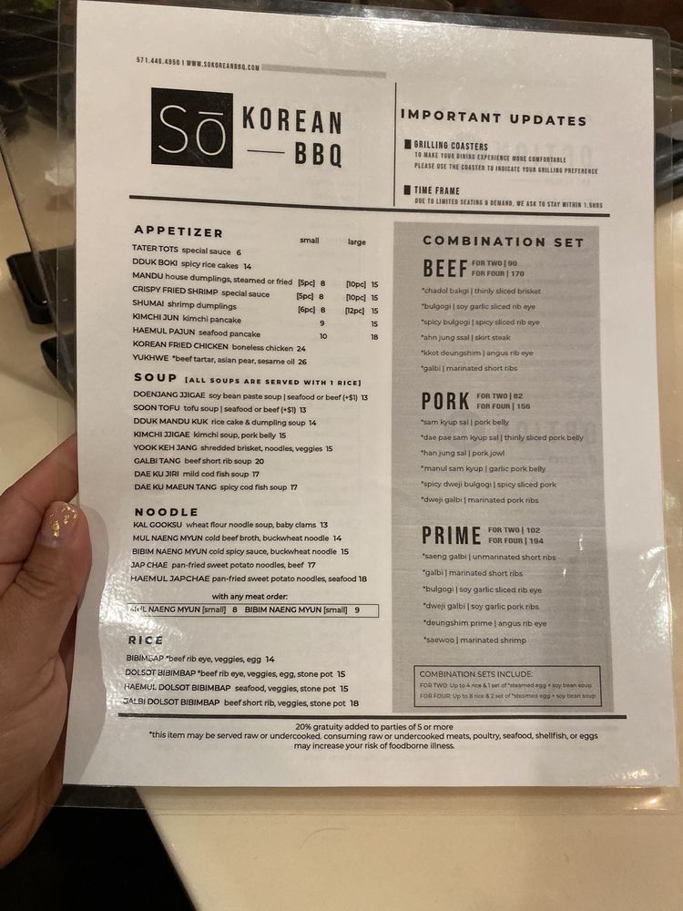 Sō Korean Barbeque, located in Centreville, VA, offers a plethora of amenities including reservation options, delivery, takeout, vegetarian dishes, and wheelchair accessibility. The restaurant provides a trendy and casual atmosphere with moderate noise levels, making it suitable for groups, kids, and various dining times. With a full bar, happy hour specials, private dining options, and outdoor seating, Sō Korean Barbeque caters to a diverse range of preferences. Customers rave about the attentive service, generous portion sizes, and delicious menu items like the spicy pork belly and galbi. The option for all-you-can-eat Korean BBQ with the choice of self-cooking or having a server grill for you is a standout feature. Don't miss out on the flavorful meats, friendly staff, and inviting ambiance at Sō Korean Barbeque.